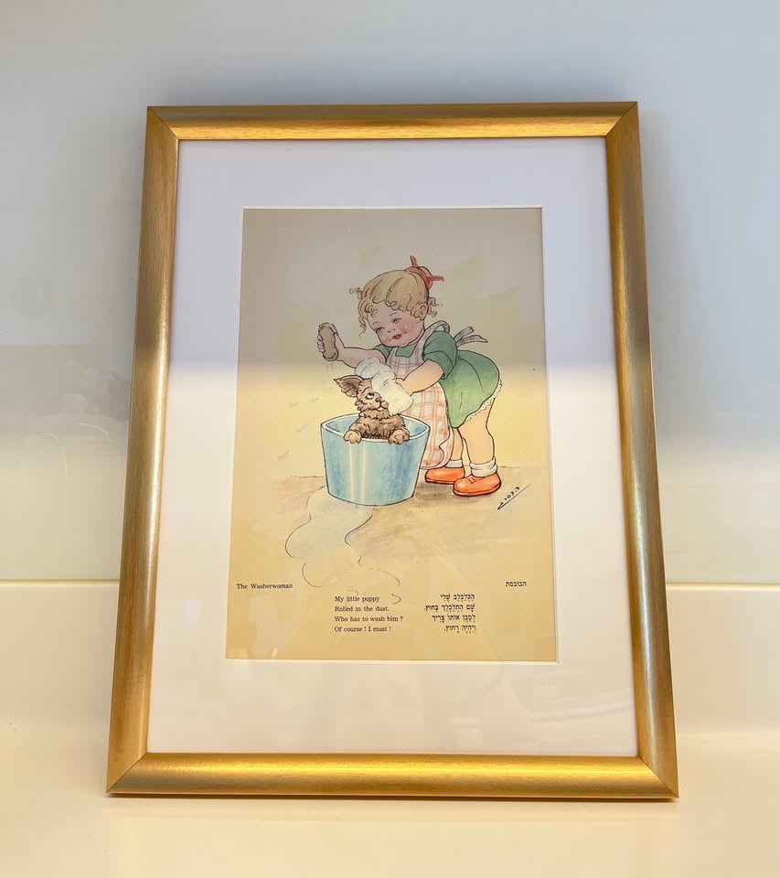 אחד מתוך שמונה הדפסים עם ציורים מקסימים של ילדים עושים פעולות שונות, של הצייר דב דהרי, מלווים בשירים של אברהם בן יצחק