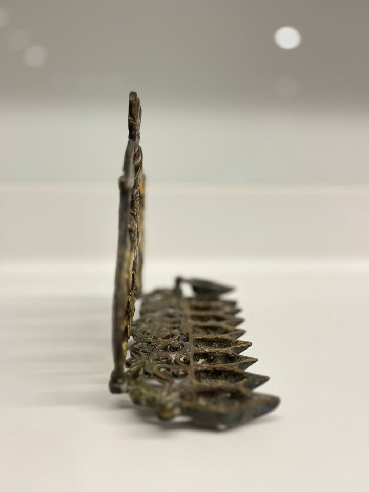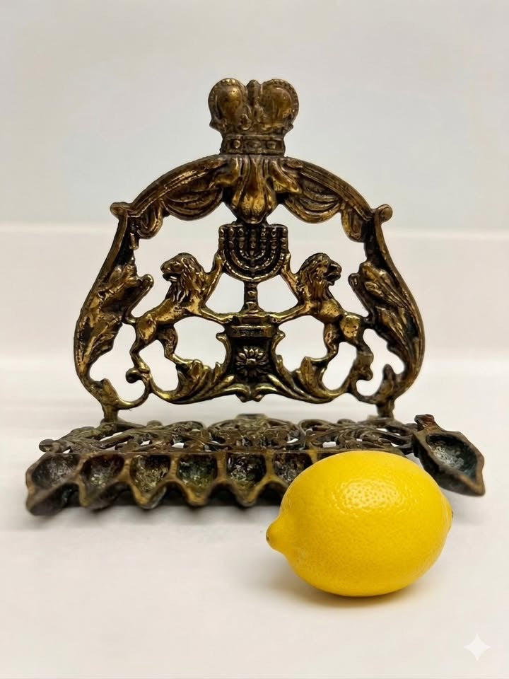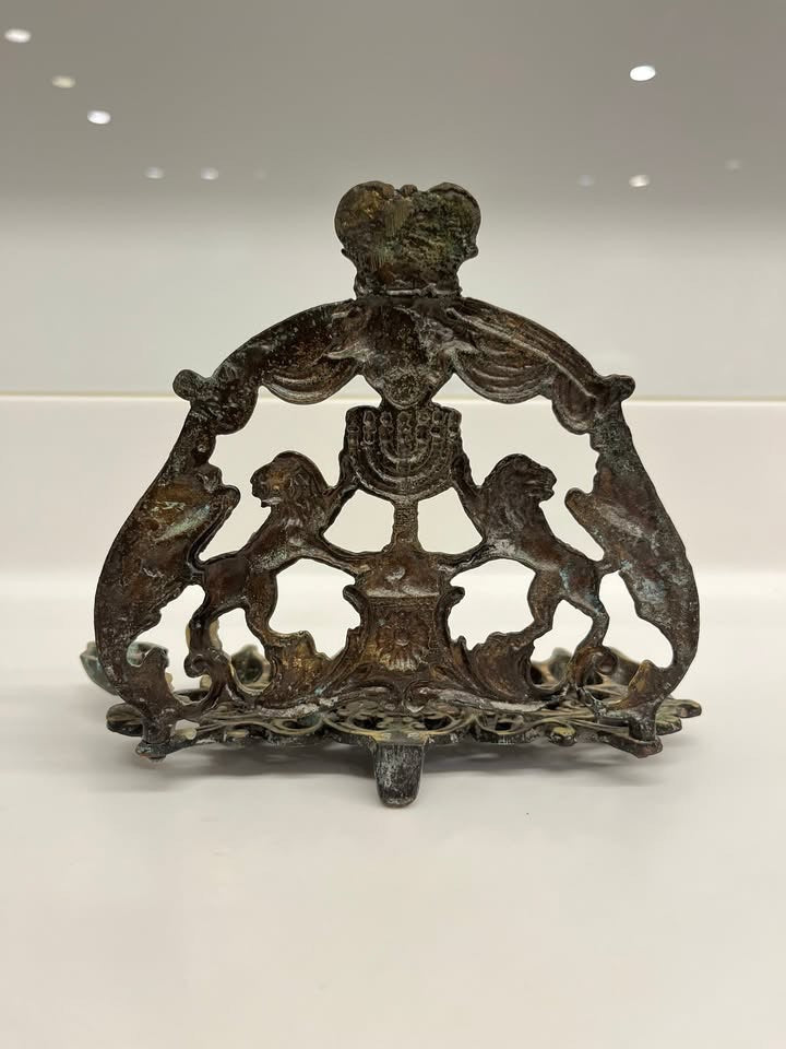 חנוכיית פליז יצוק, מעוטרת בתבליטי אריות וסמל המנורה, המאה ה-20.