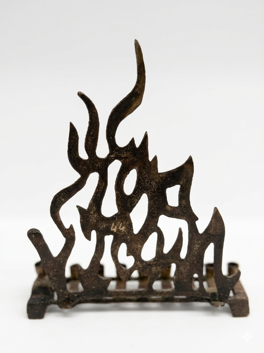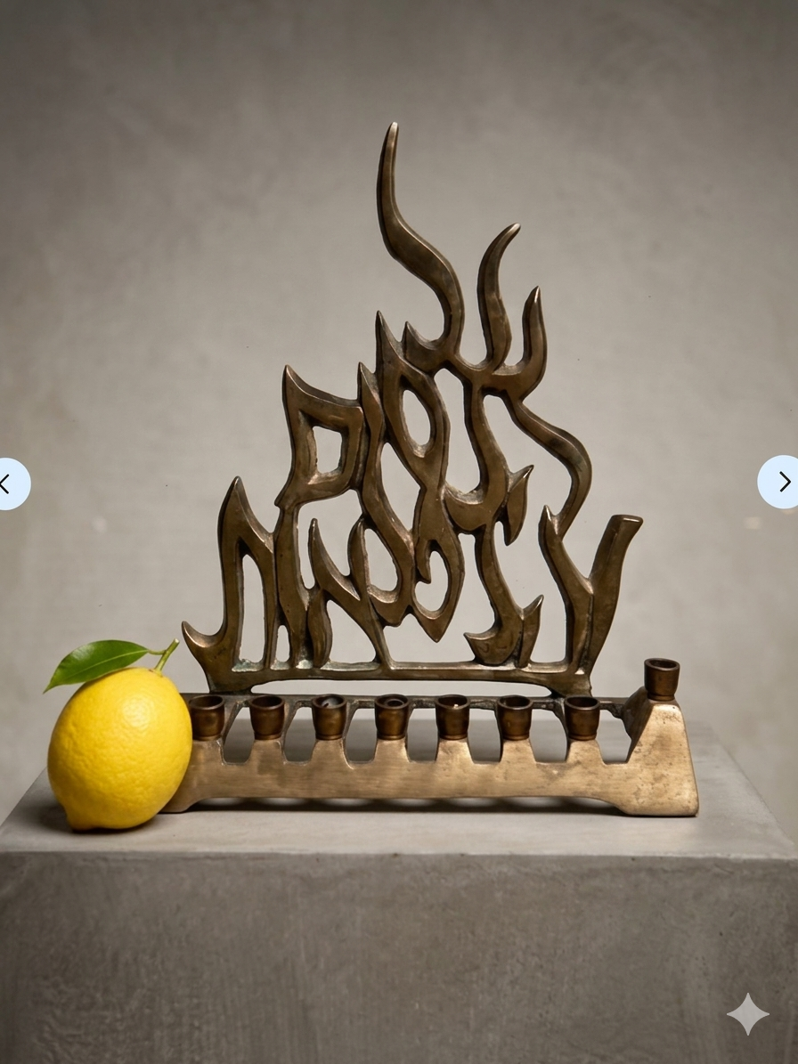 חנוכיית פליז וינטג' ישראלית, עם הכיתוב ״על הניסים והנפלאות״. ממוספרת, לא חתומה