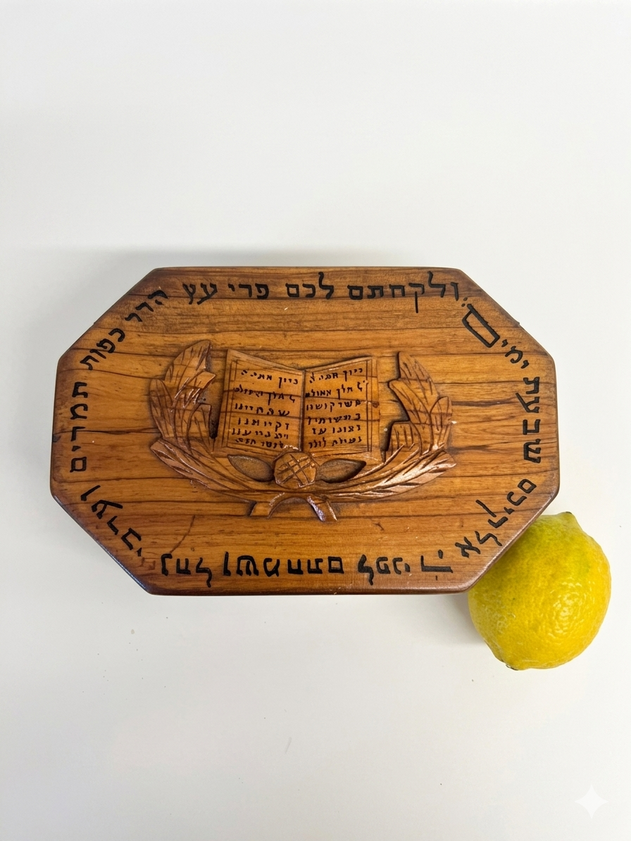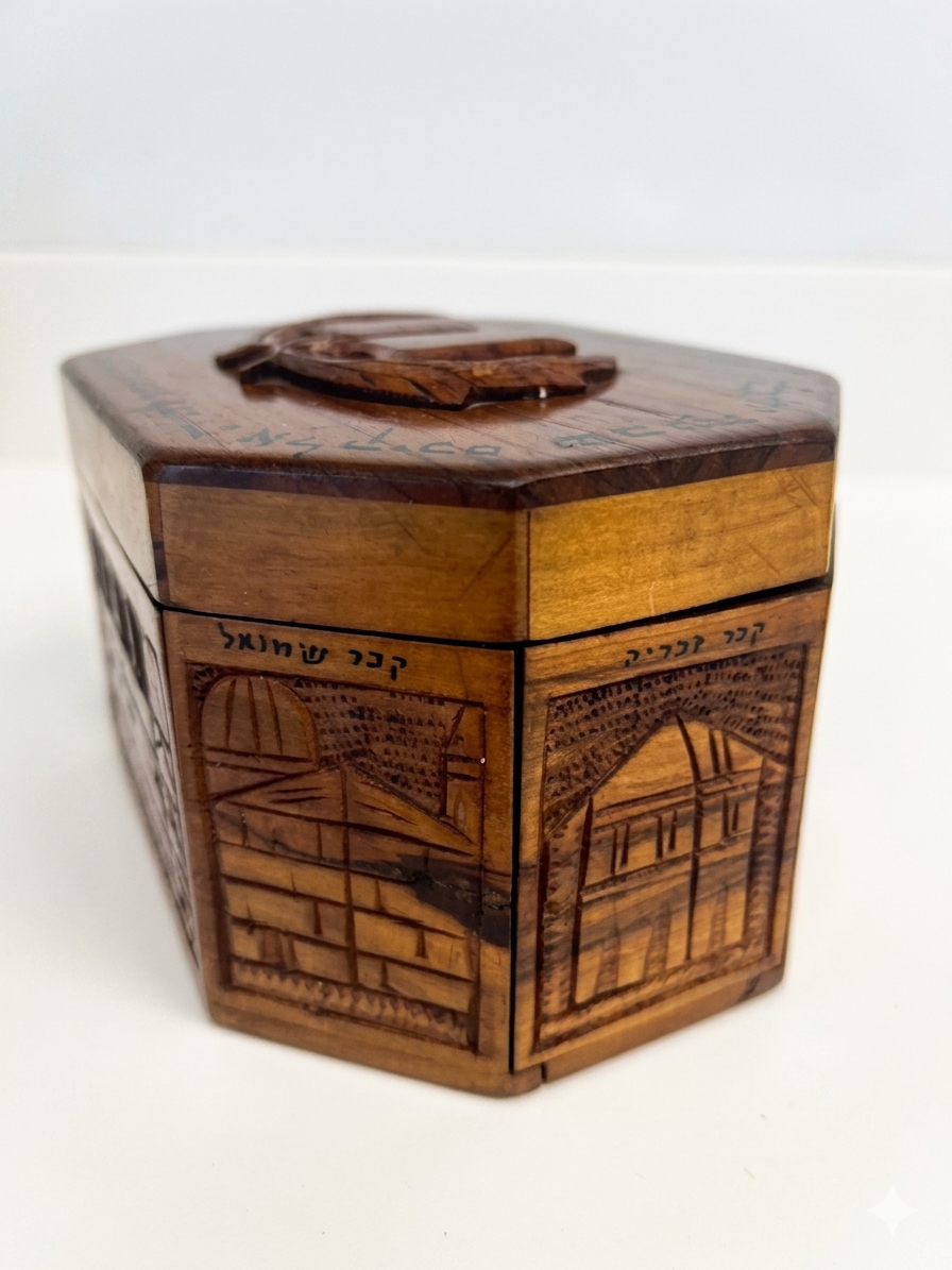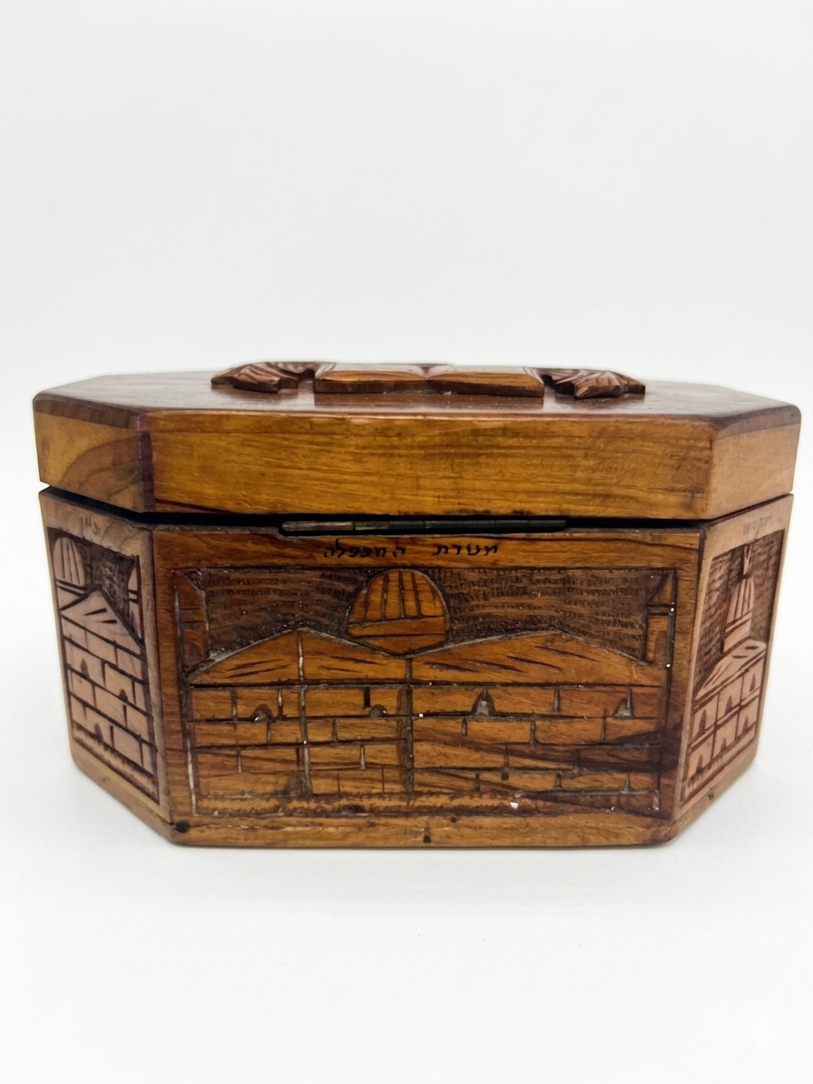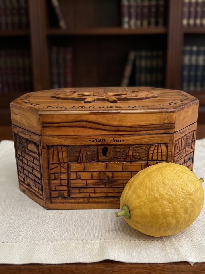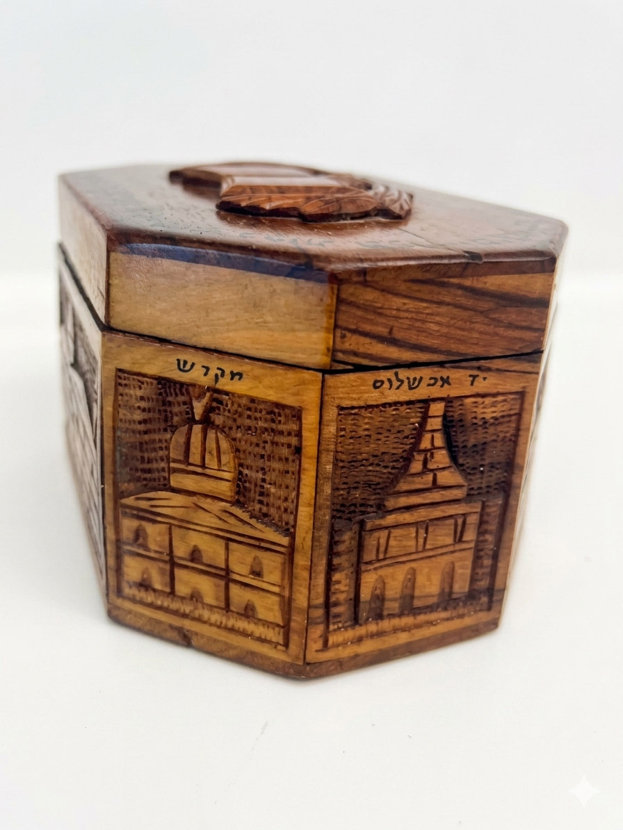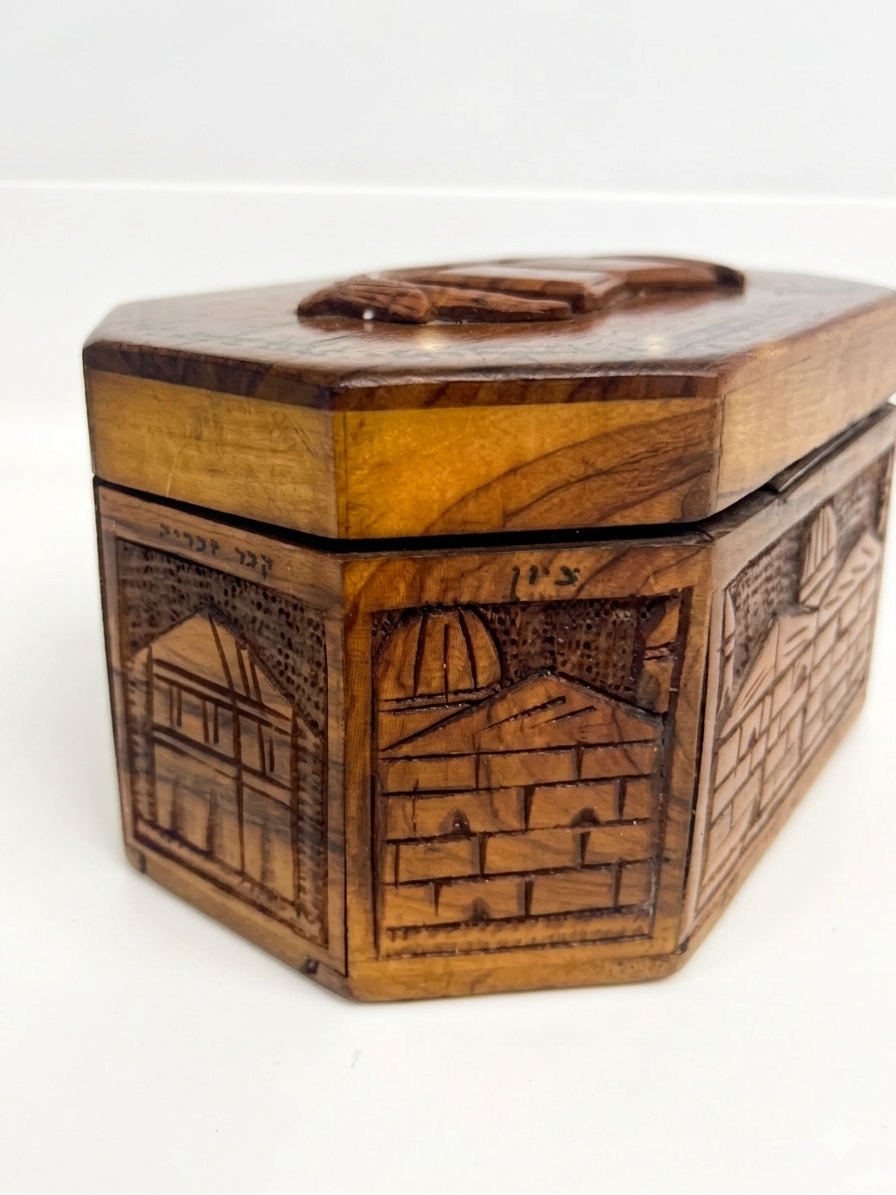 קופסת אתרוג עתיקה עשויה עץ זית, מעוטרת עבודות חריטה ובלט בדמות מקומות קדושים בארץ ישראל, הכל בעבודת יד אמן מתחילת המאה ה-20. המכסה מעוטר בתבליט מראה ספר פתוח עם ברכת "על נטילת לולב", וברכת "שהחיינו", משני צידיו ענפי עלים. הצדדים מעוטרים בעבודת גילוף במראה הכותל המערבי, קבר רחל, עיר ציון, יד אבשלום, מקום המקדש, מערת המכפלה, קבר שמואל הנביא וקבר זכריה הנביא