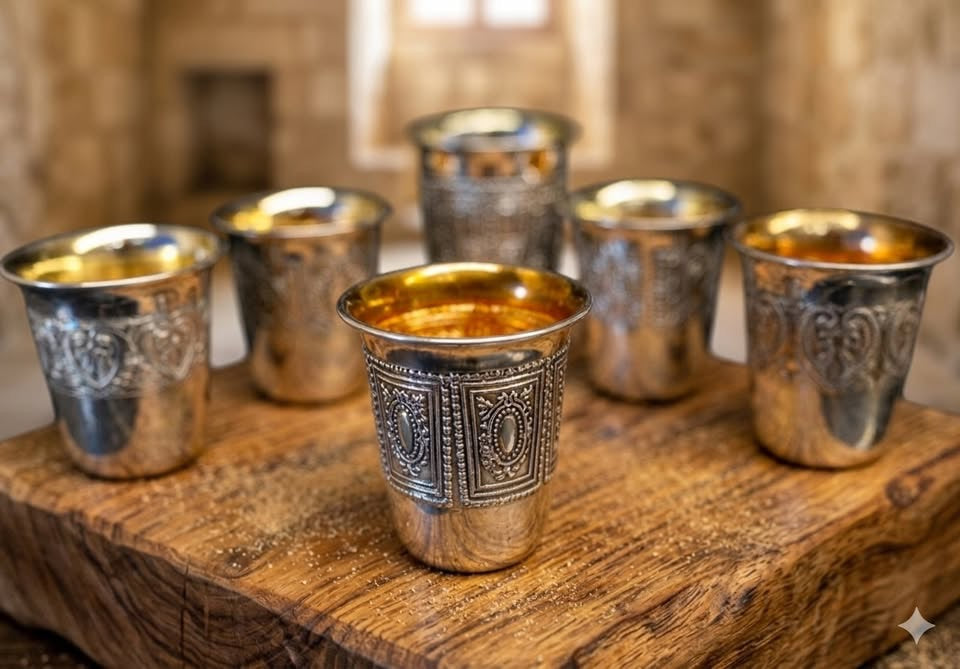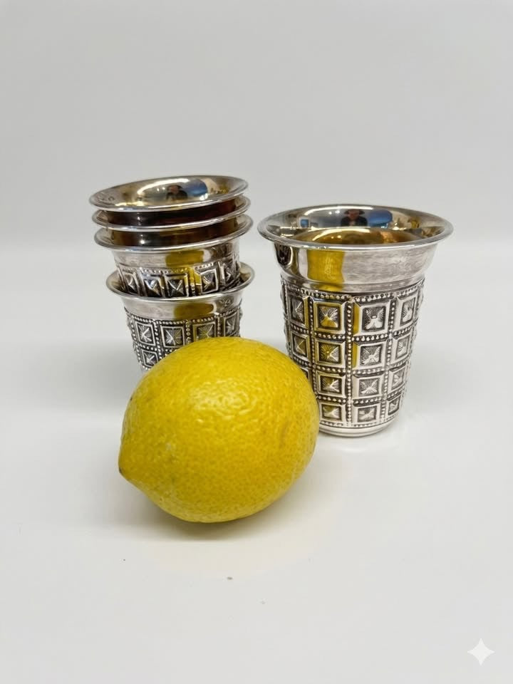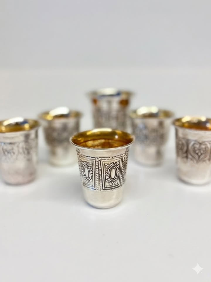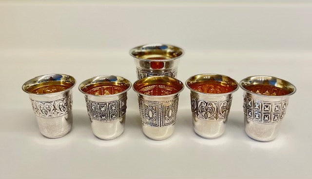 שש כוסיות ליקר מצופות כסף איכותי ועבה (999), בדגמים שונים. מסדרת מורשת.