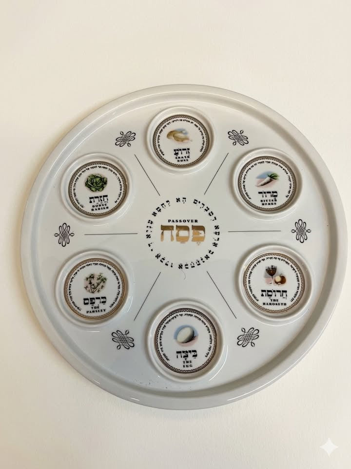 הצלחת כוללת שישה שקעים עם הדפס של מרכיבי הסדר בעברית ובאנגלית בסגנון וינטג׳