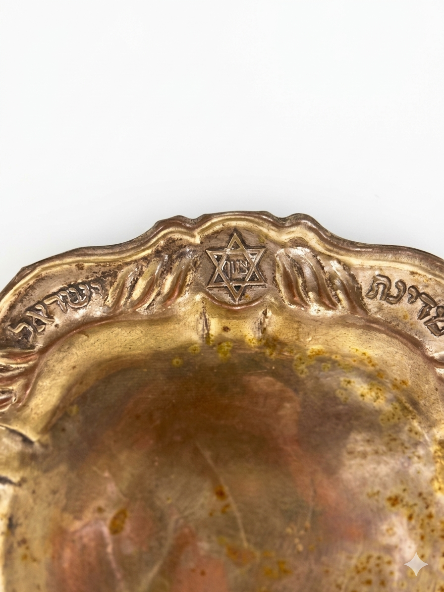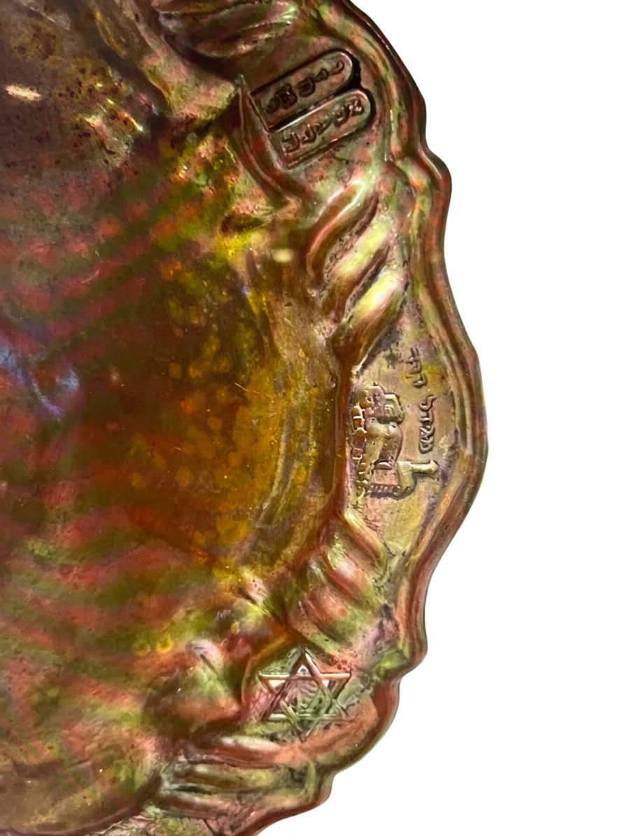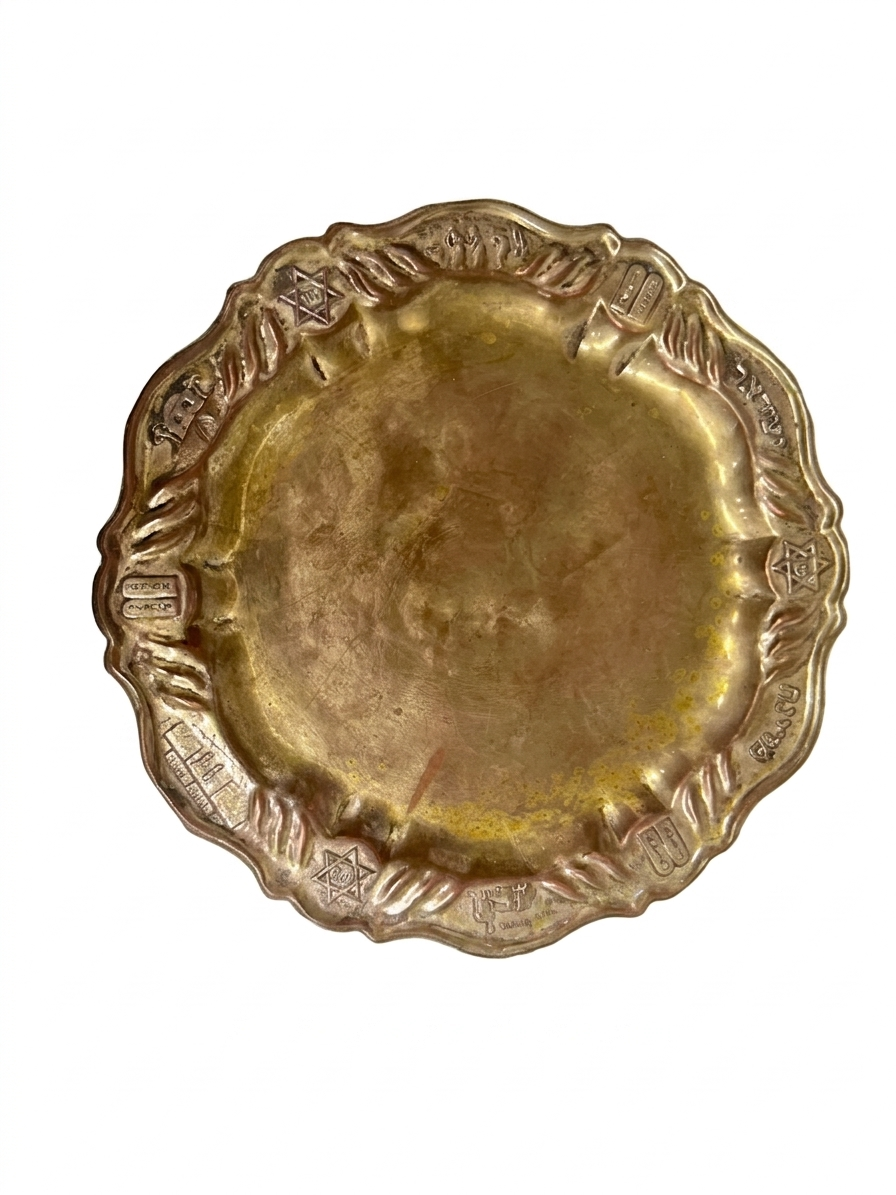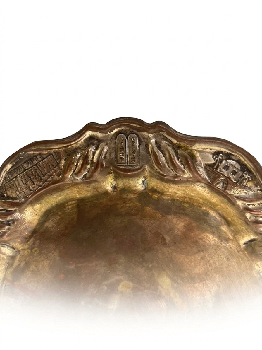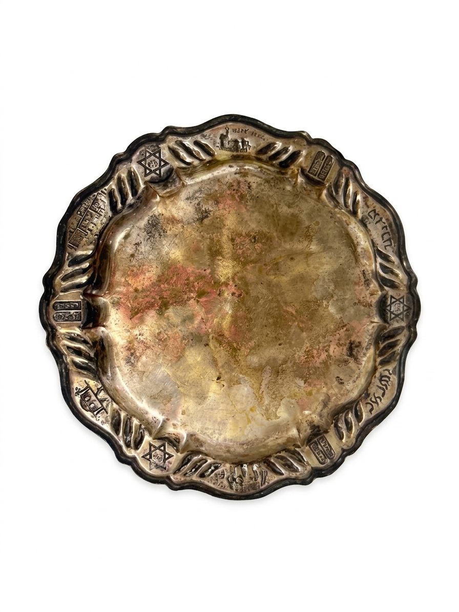 צלחת/מגש מדינת ישראל, מנחושת מצופה כסף, עם תבליטים הקשורים לישראל. (מגדל דוד, קבר רחל, כותל מערבי, לוחות הברית, אליעזר ורבקה...) קיימים סימני זמן